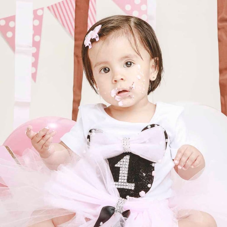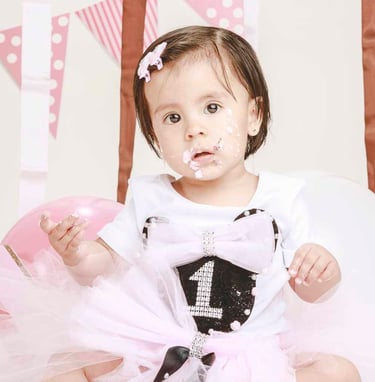 Déjanos capturar los momentos más dulces de tu bebé mientras juega con un pastel de cumpleaños.